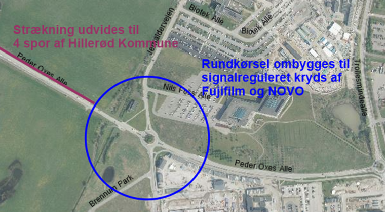 Fra marts 2026 ombygger Fujifilm og Novo den eksisterende rundkørsel i krydset Peder Oxes Alle / Jernaldervejen / Brennum Park til et signalreguleret kryds.