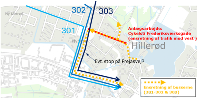 Busser 301, 302 og 303 mod øst (ind mod byen) vil køre ad Frejasvej og Herredsvejen i stedet for Frederiksværksgade og Slotsgade. Busser mod vest kører som normalt.