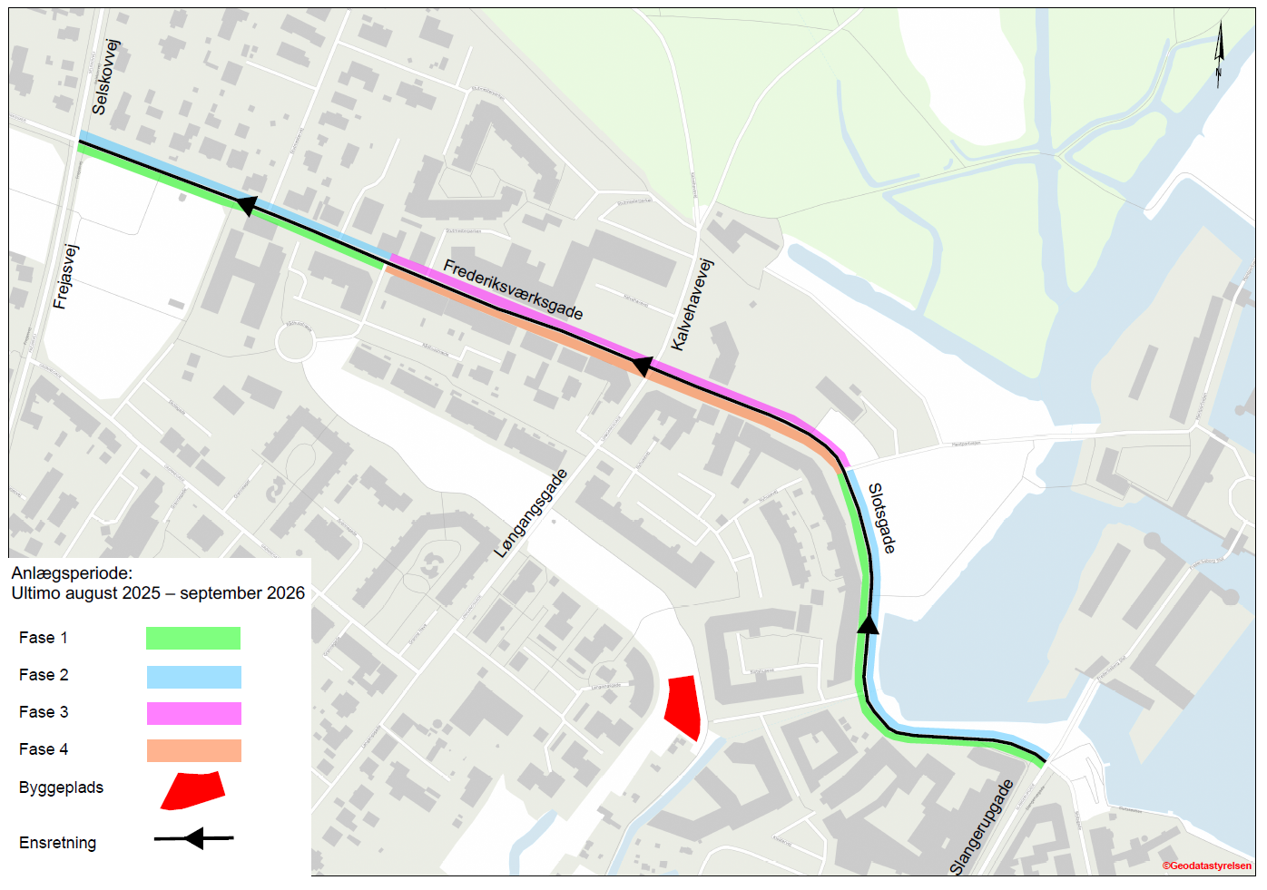 Frederiksværksgade og Slotsgade bliver ensrettet mod vest (fra Slangerupgade til Frejasvej/Selskovvej) under hele anlægsperioden. Det gør arbejdet hurtigere og mere sikkert. Cyklister og fodgængere vil kunne færdes i begge retninger.